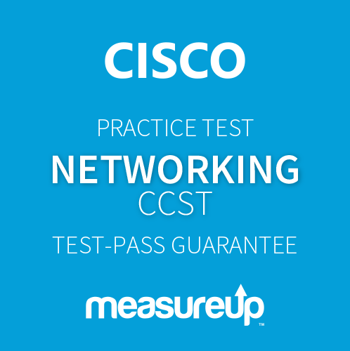 The MeasureUp CCST: Cisco Certified Support Technician Networking practice test. Pearson logo. MeasureUp logo